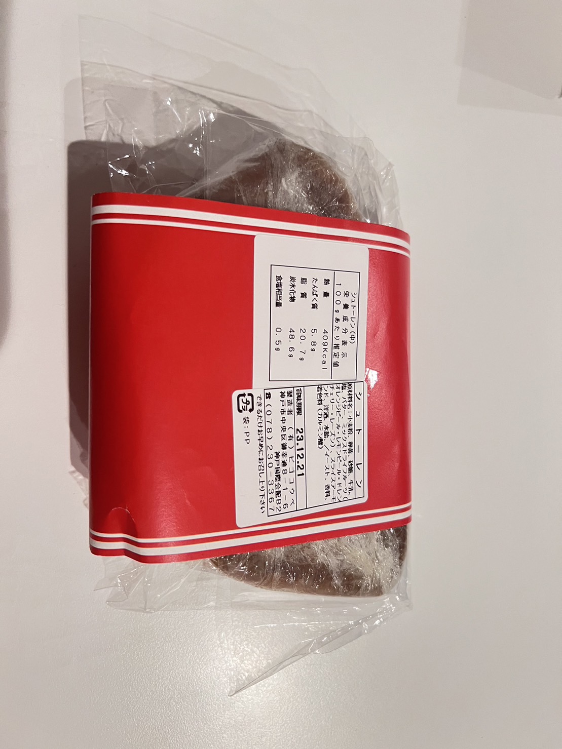 原材料:小麦粉、卵黄、砂糖牛乳、塩、バター、ミックスドライフルーツ(チェリー、レーズン)、スライスアーモンド、洋酒、水飴、/イースト、香料、着色料(カルミン酸)